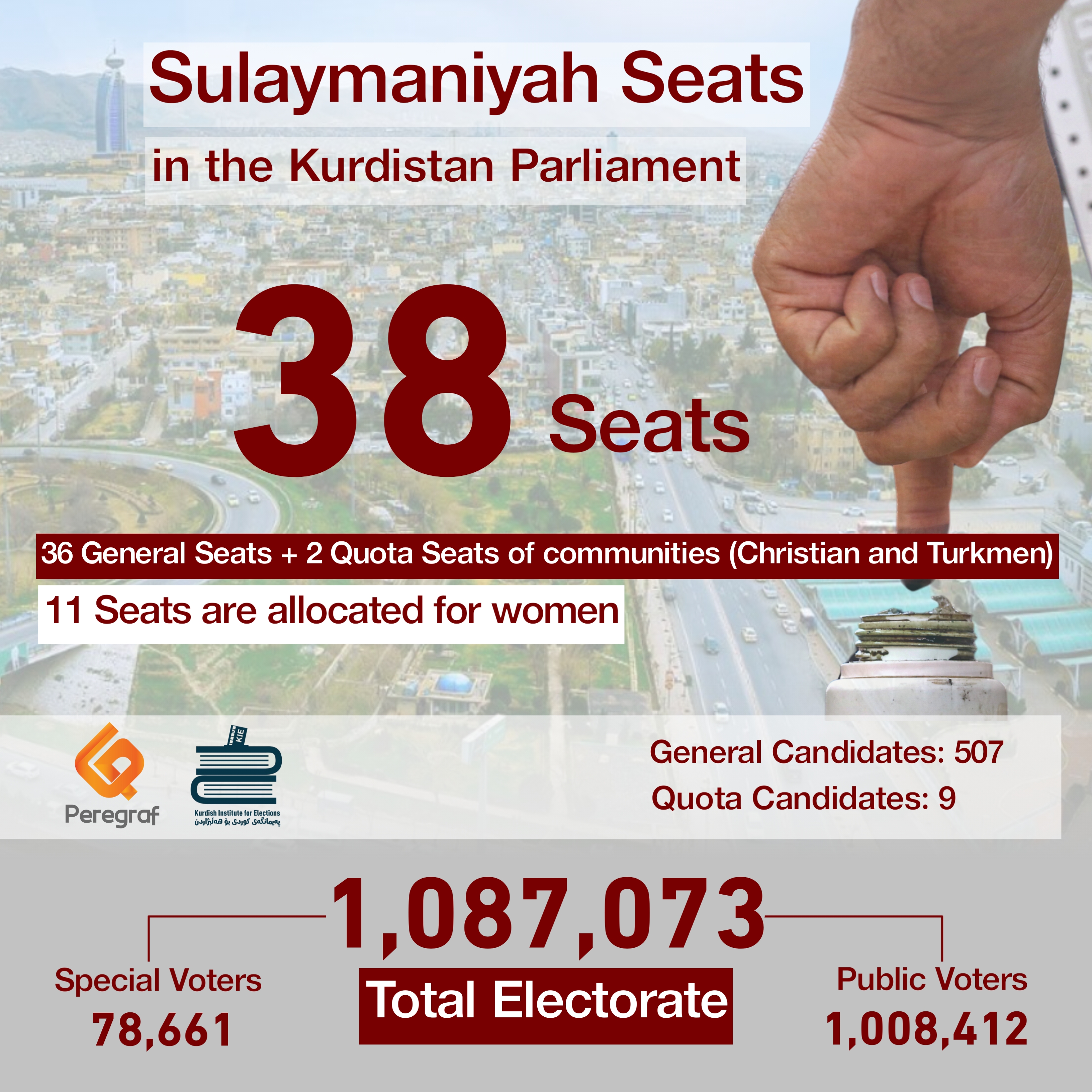 The Sulaymaniyah constituency has over 1 million eligible voters, with 1,008,412 general voters and 78,661 special voters.
