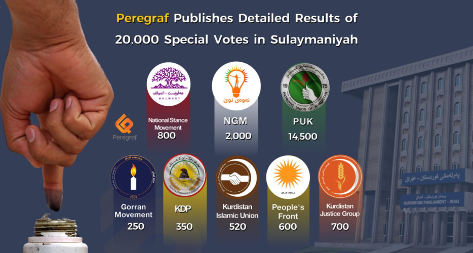Peregraf has obtained detailed results from approximately 20,000 special votes cast in the Sulaymaniyah, including Sulaymaniyah, Garmian, and Raparin. These results come partly from official sources within political parties, while others have been independently gathered. According to the data, the Patriotic Union of Kurdistan (PUK) leads the race, securing over 14,000 votes.