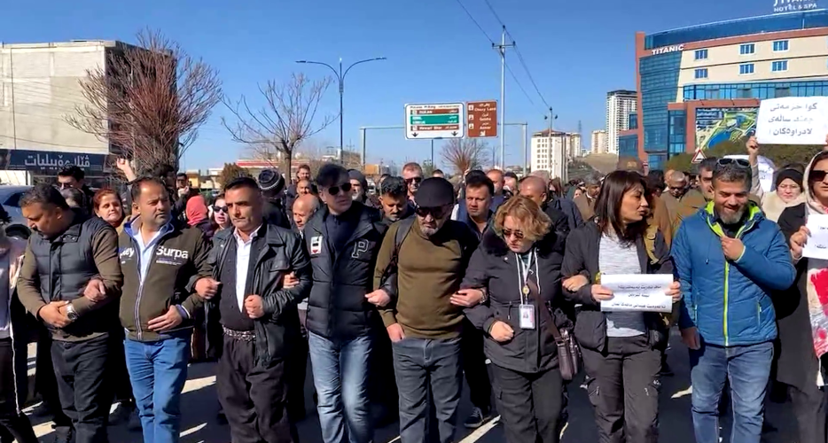 Teachers and public sector workers in Sulaymaniyah took to the streets today, marching from Malik Mahmoud Ring Road to the United Nations office to protest the ongoing salary crisis and the lack of action on the Iraqi Federal Court's ruling regarding the Tawteen program.