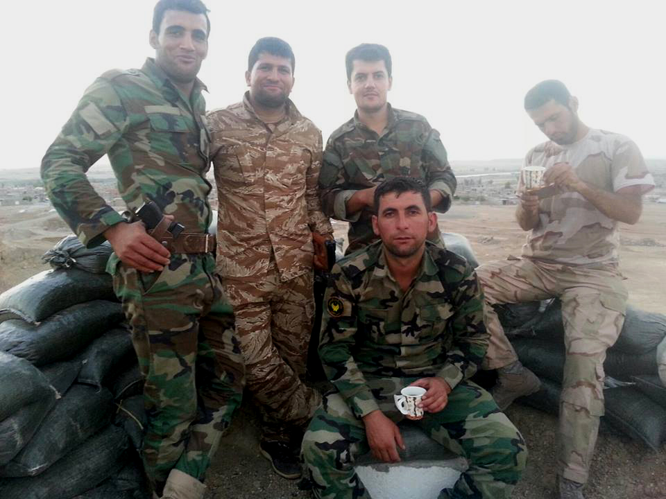 Saman (sitting down) with his colleagues during the fight against ISIS