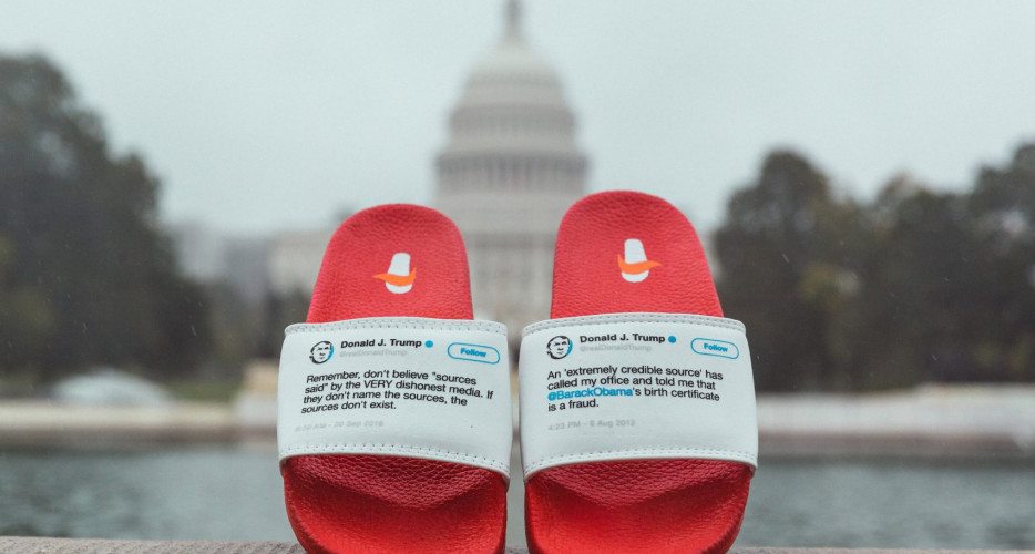 نرخی جوتێك نەعلی تویتەكانی ترەمپ 25 دۆلارە و لە ماوەیەكی كەمدا ژمارەیەكی زۆری لێ فرۆشراوە.