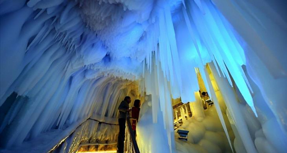 ناو ئەشكەوتەكەو دیوارەكانیشی یەكپارچە بە سەهۆڵ داپۆشراوە. بەهۆی ساردیی لەڕادەبەدەری، ستوونی گەورەی سەهۆڵین لە زەوی بۆ سەقفی ئەشكەوتەكە دروست بووە.