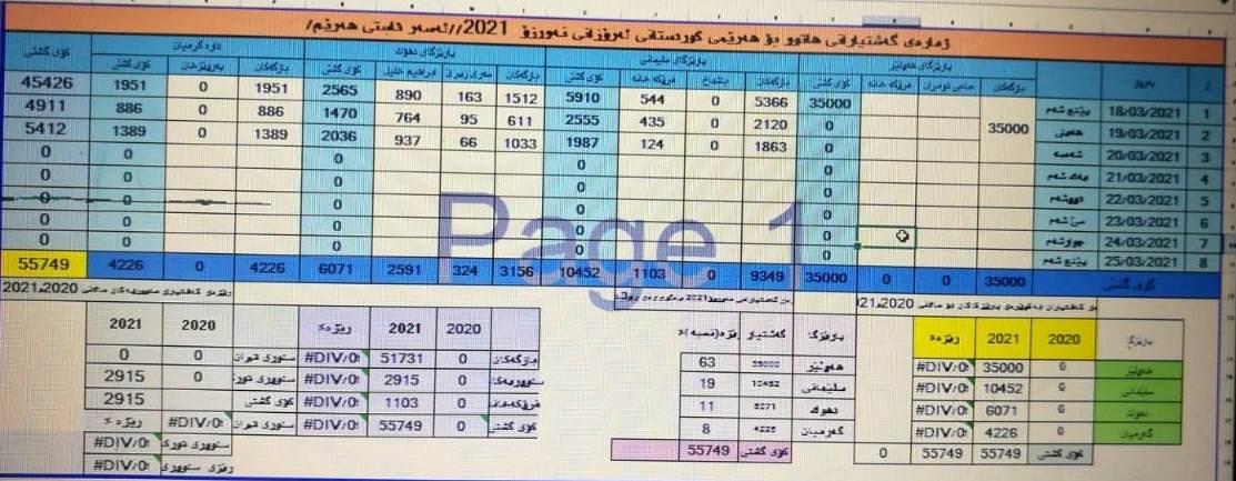 بەپێی خشتەیەكی ئاماری گەشتیارانی دەستەی گشتیی گەشتوگوزار كە وێنەیەكی دەست پەرەگراف كەوتووە، لە ڕۆژانی 18 و 19 و 20ی ئەم مانگەدا، 55 هەزار و 749 گەشتیار لە ڕێگەی پارێزگاكانی هەولێر، سلێمانی، دهۆك و ئیدارەی گەرمیانەوە كە دەروازەیان لەگەڵ پارێزگاكانی عێراقدا هەیە، ڕوویان لە هەرێم كردووە.