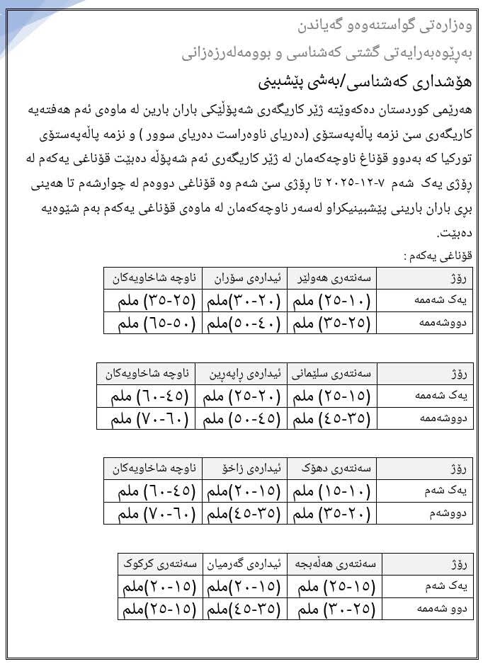بەپێی پێشبینیی کەشناسیی هەرێم، تەنیا لە شەپۆلی یەکەمدا لە هەولێر: 35 بۆ 60 ملم، سلێمانی: 50 بۆ 70 ملم، هەڵەبجە: 40 بۆ 55 ملم، ئیدارەی گەرمیان: 50 بۆ 65 ملم، ئیدارەی ڕاپەڕین: 65 بۆ 75 ملم، ئیدارەی سۆران: 60 بۆ 80 ملم، ئیدارە زاخۆ: 50 بۆ 65 ملم باران ببارێت.