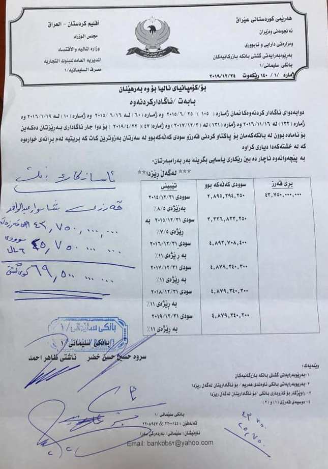 چەندین جار حكومەت بە نووسراوی فەرمیی كۆمپانیای نالیای ئاگادار كردووەتەوە كە قەرزەكە بگەڕێنێتەوە، بەڵام كۆمپانیاكە ئامادە نەبووە، لە ئێستاشدا بەپێی یاسای چاكسازیی، هەموو ئەو كۆمپانیا و بازرگانانەی كە قەرزیان لە حكومەت وەرگرتووە دەبێت قەرزەكە و كۆی گشتی سودی كەڵەكەبوو بۆ حكومەت بگەڕێننەوە.