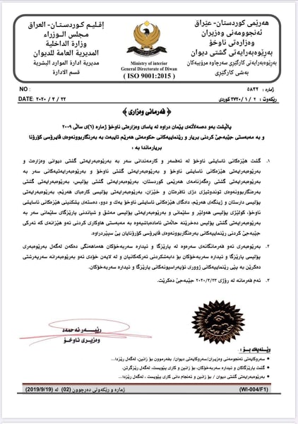 بە فەرمانی وەزیری ناوخۆی هەرێمی كوردستان، سەرجەم هێزەكانی ئاسایشی ناوخۆ و بەڕێوەبەرایەتییەكانی پۆلیس دەخرێنە حاڵەتی ئامادەباشییەوە.