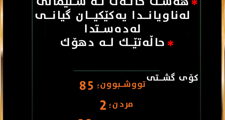 3. کۆی گشتی هەڵگرانی ڤایرۆسی کۆڕۆنای نوێ COVID-19 لە هەرێمی کوردستان (٨٥) تووشبووە، لەنێویاندا (٢) مردن هەیە و (٢٢) نەخۆش بەتەواوی چاکبووەتەوە، و ئەوانی تر هەموویان لەژێر چاودێری پزیشکی دان.