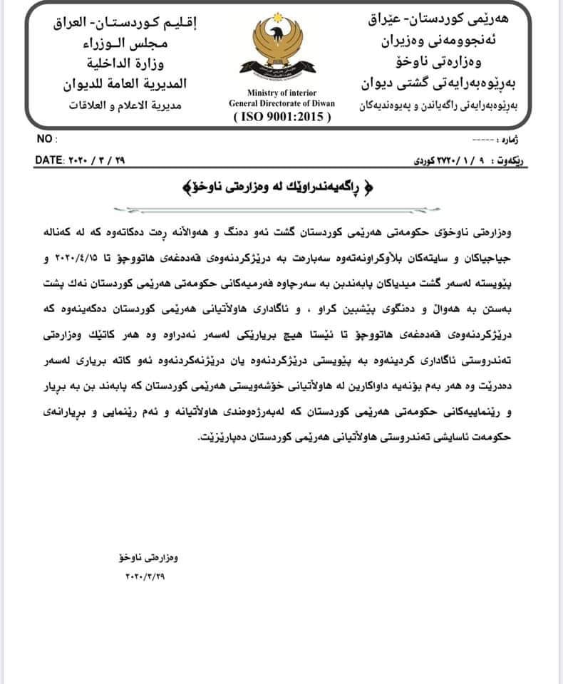 وەزارەتی ناوخۆی هەرێم ڕاگەیەندراوێكی بڵاوكردەوەو تێیدا هۆشداریی تووند دەدات بەوانەی "بە ئاشكرا داوای سەرپێچیكردنی یاساو ڕێنماییەكان دەكەن"و دەڵێت: هەر سەرپێچیو پێشێلكاریو گردبوونەوەیەك ڕوبەڕوی سزای یاساییان دەكاتەوە.