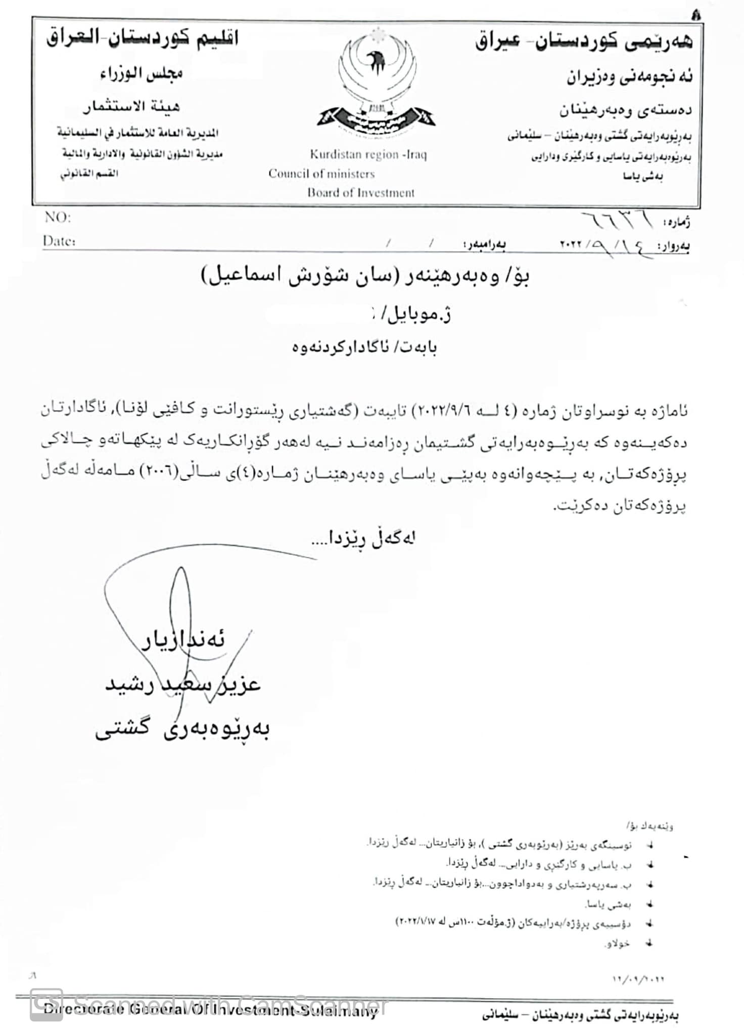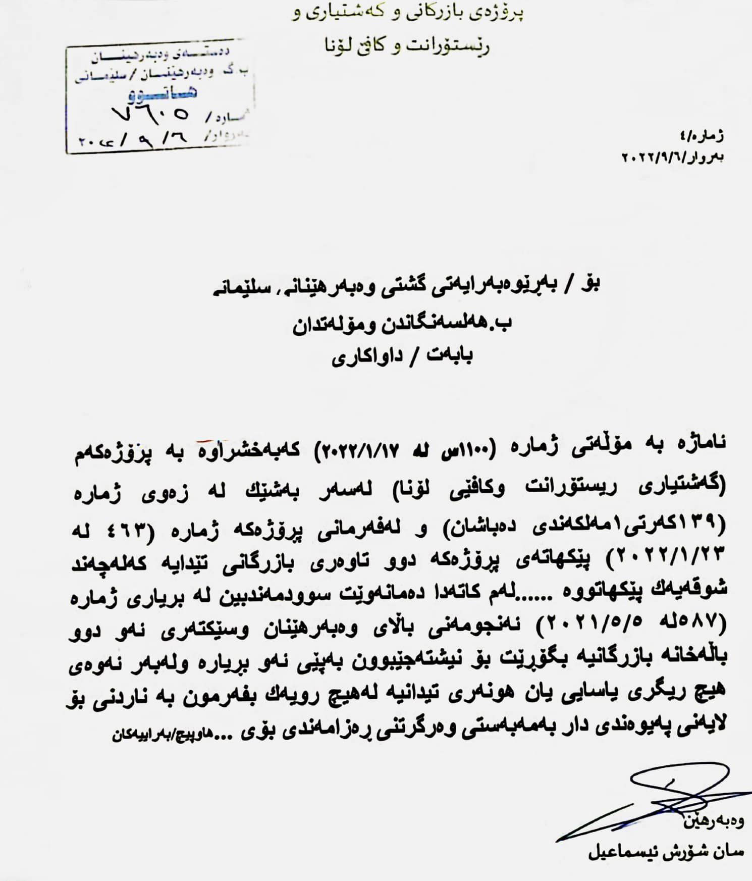 لە نووسراوێکدا بۆ وەبەرھێنانی سلێمانی کە وێنەیەکی دەست پەرەگراف کەوتووە، کوڕی وەزیری پێشمەرگە داوای ڕەزامەندیی دەکات بۆ گۆڕینی سێکتەری دوو تاوەرەکە لە بازرگانییەوە بۆ نیشتەجێبوون، بەو پێیەی قازانجی زیاترە، بەڵام وەبەرھێنان داواکارییەکەی ڕەتکردووەتەوە.