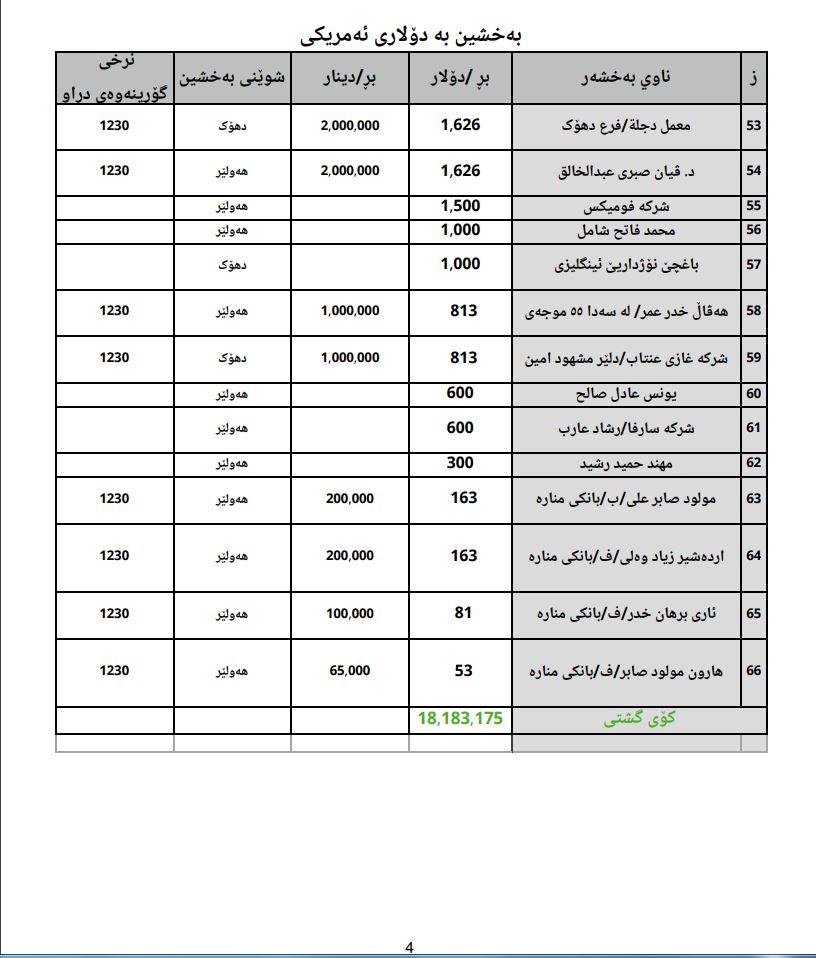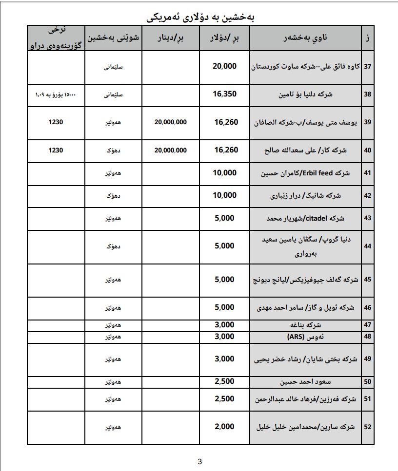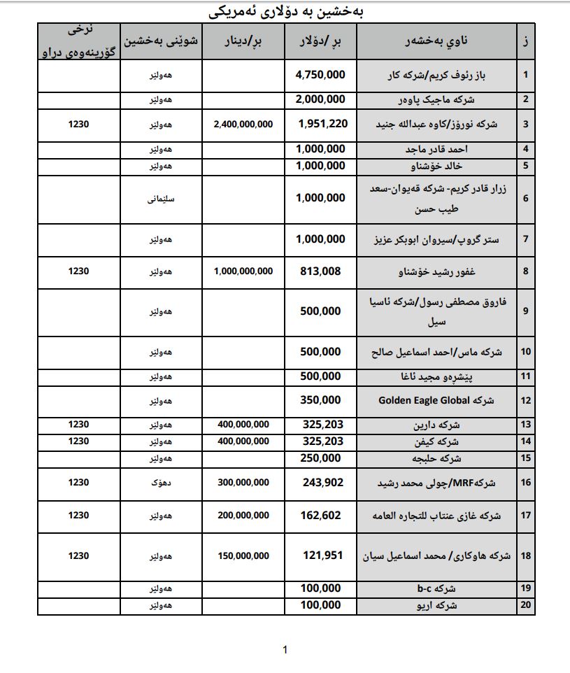 خشتەی ناوی سەرمایەدارانو بڕی هاوكارییەكانیان