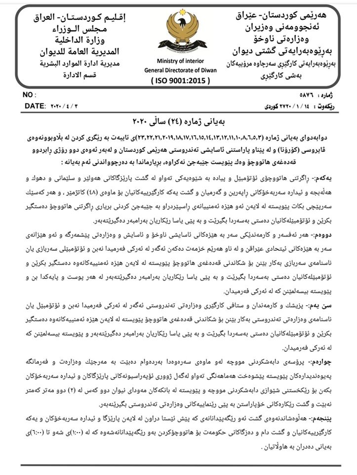 وەزارەتی ناوخۆی هەرێم ڕێکارەکانی ڕوبەڕوبوونەوەی کۆرۆنای تووندتر کردەوەو لە راگەیەندراوێکدا دەڵێت: بۆ ماوەی 48 کاتژمێر هاتووچۆی ئۆتۆمبێل و پیادە بەتەواوی قەدەغە دەکرێت و هەرکەس سەرپێچیی بکات سزا دەدرێت.