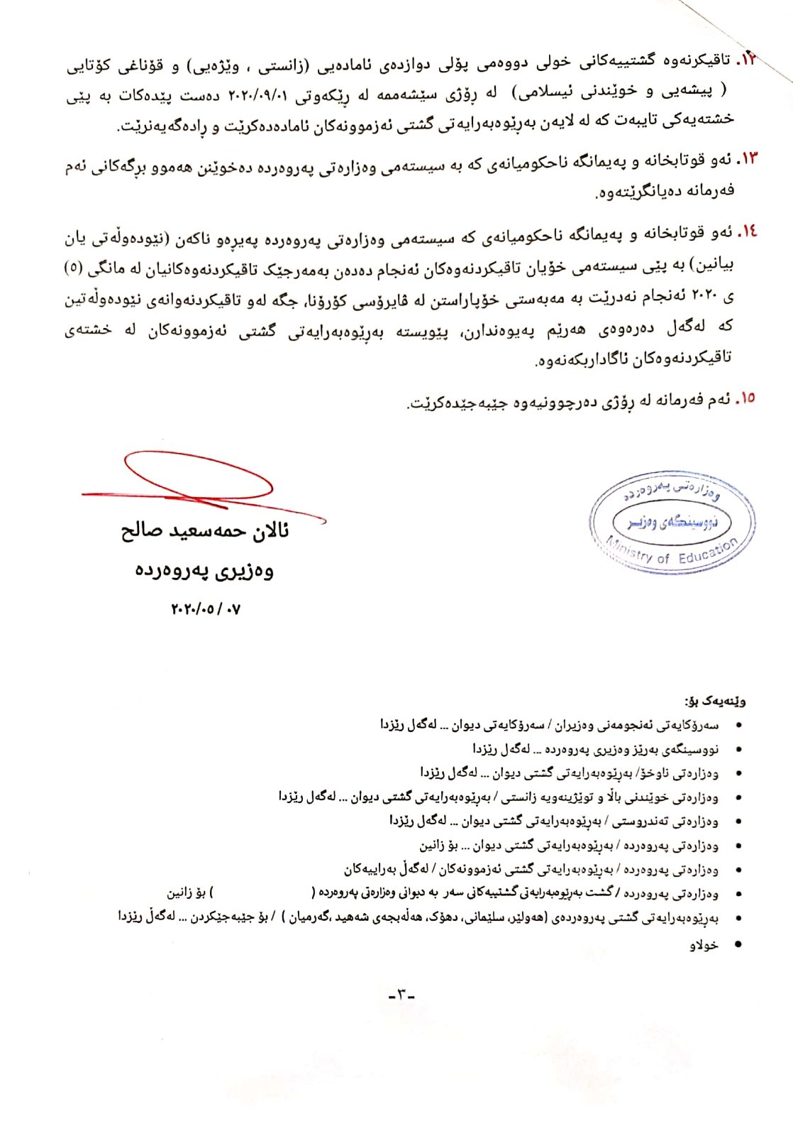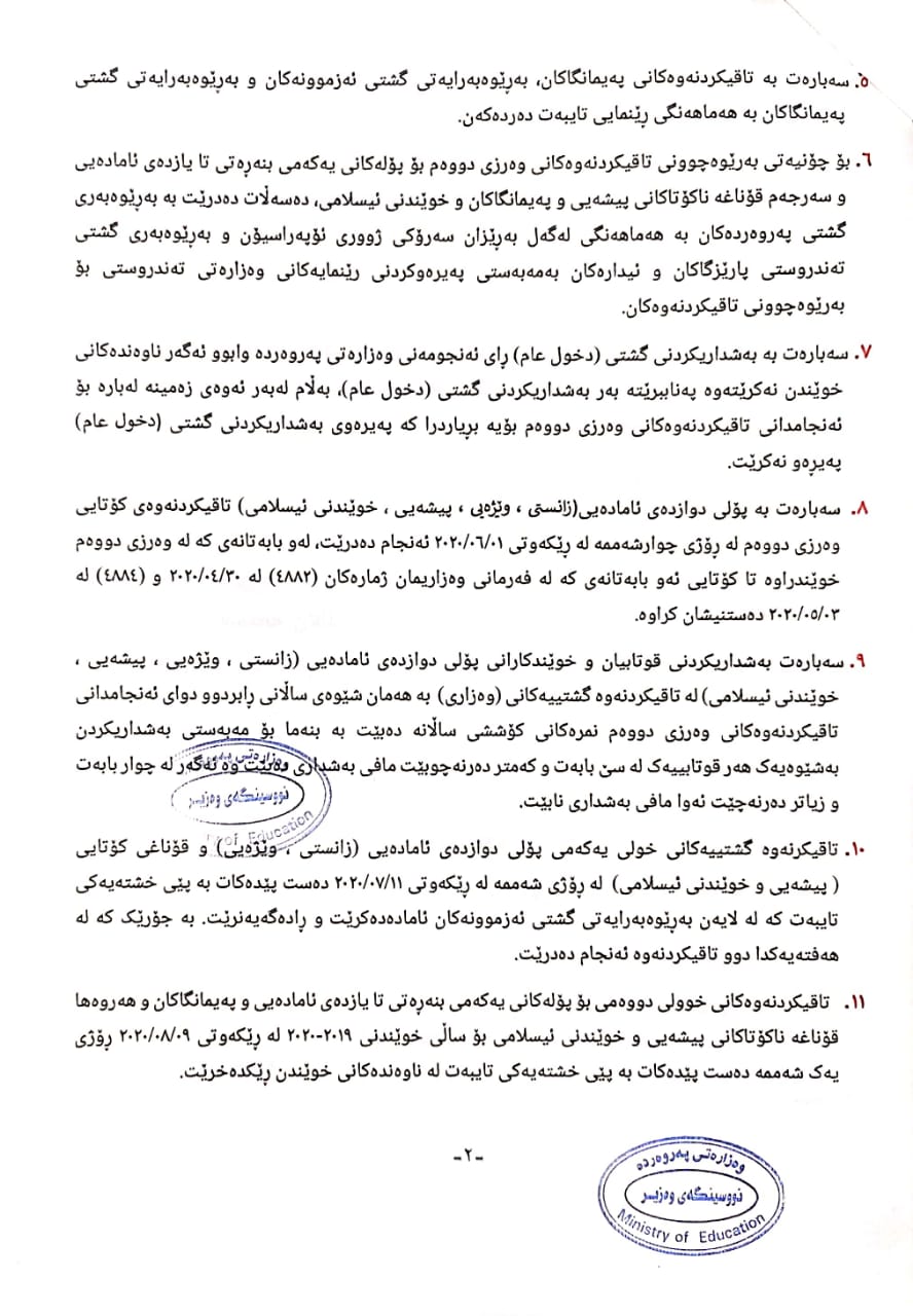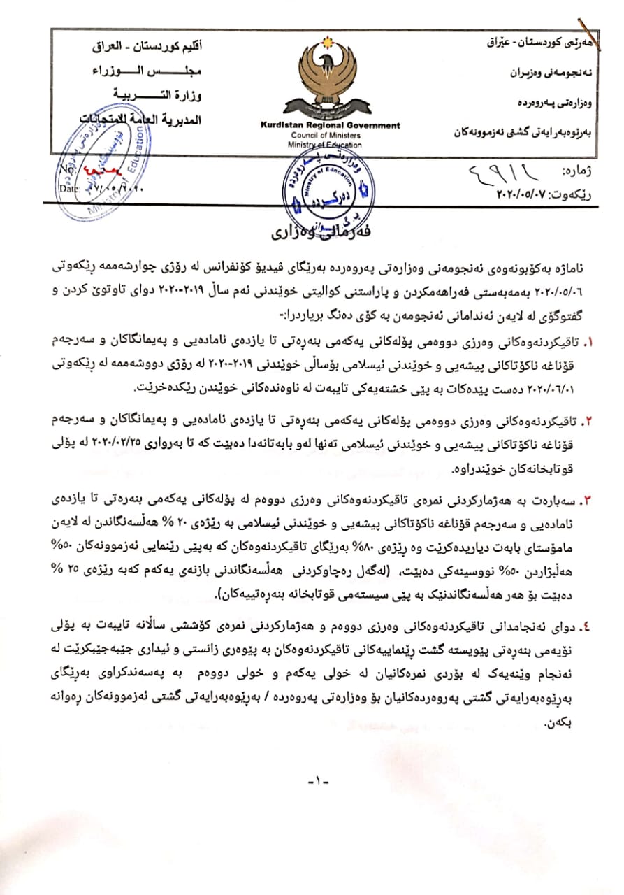 وەزارەتی پەروەردەی هەرێمی کوردستان رایگەیاند، تاقیکردنەوەکانی وەرزی دووەمی پۆلەکانی یەکەمی بنەڕەتی تاوەکو یازدەی ئامادەیی و پەیمانگەکان و سەرجەم قۆناخە ناکۆتاکانی پیشەیی و خوێندنی ئیسلامی لە رۆژی دووشەممە 1-6-2020 دەستپێدەکات.