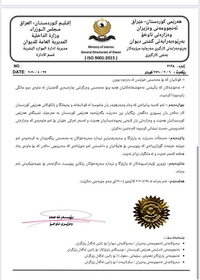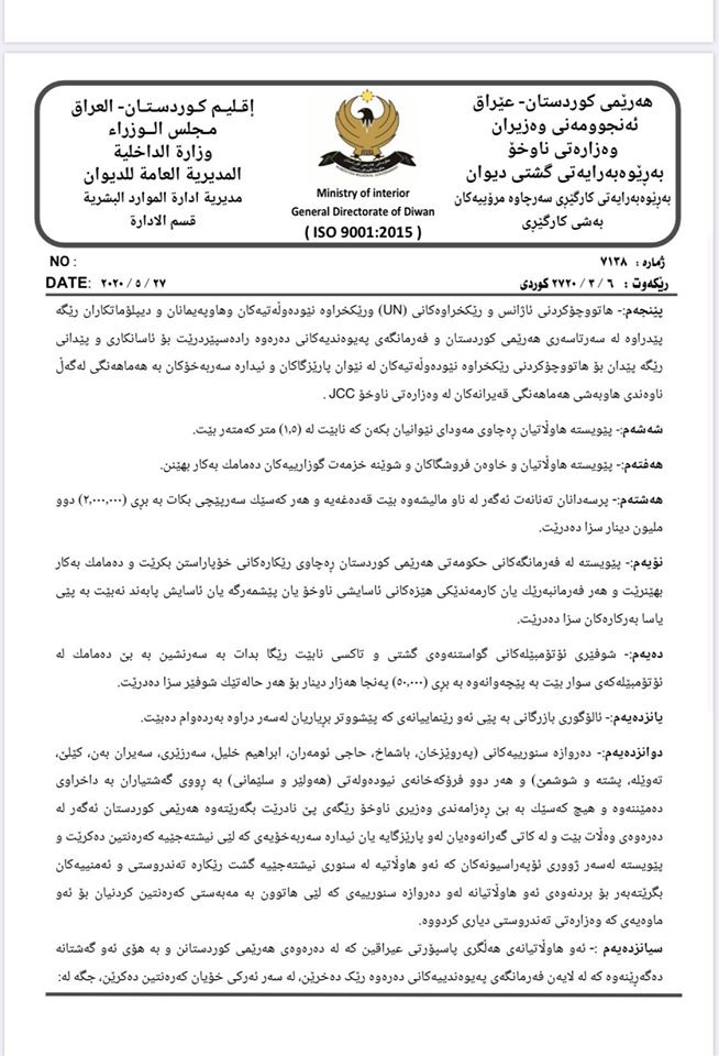 دەقی بڕیارە نوێیەكانی وەزارەتی ناوخۆ