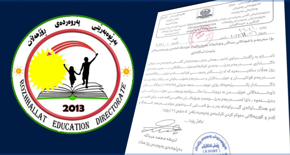 بەڕێوەبەری پەروەردەی ڕۆژهەڵات لە سلێمانی بە نووسراوێك جەخت دەكاتەوە كە سبەی 27-11-2023 "دەرگای ناوەندەكانی خوێندن دەكرێنەوە و ڕەوشی خوێندن ئاسایی دەكرێتەوە".