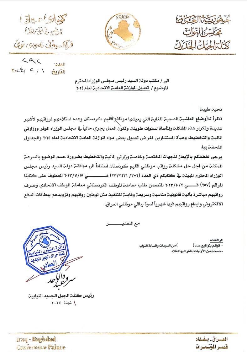 فراکسیۆنی نەوەی نوێ لە پەرلەمانی عێراق ڕایگەیاند، واژۆی 81 پەرلەمانتاریان کۆکردووەتەوە بۆ پشتیوانی نووسراوێکیان کە تێیدا داوا دەکەن نووسراوێکی پێشتری محەمەد شیاع سوودانی جێبەجێ بکرێت بۆ پێدانی مووچەی هەرێم ڕاستەوخۆ لەلایەن بەغداوە.