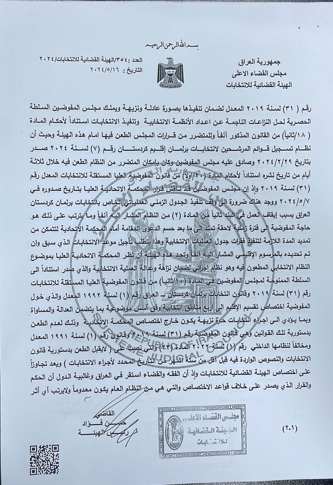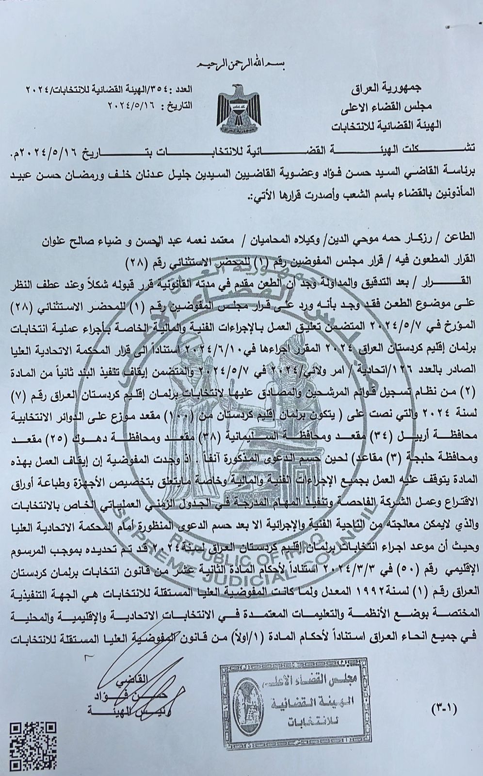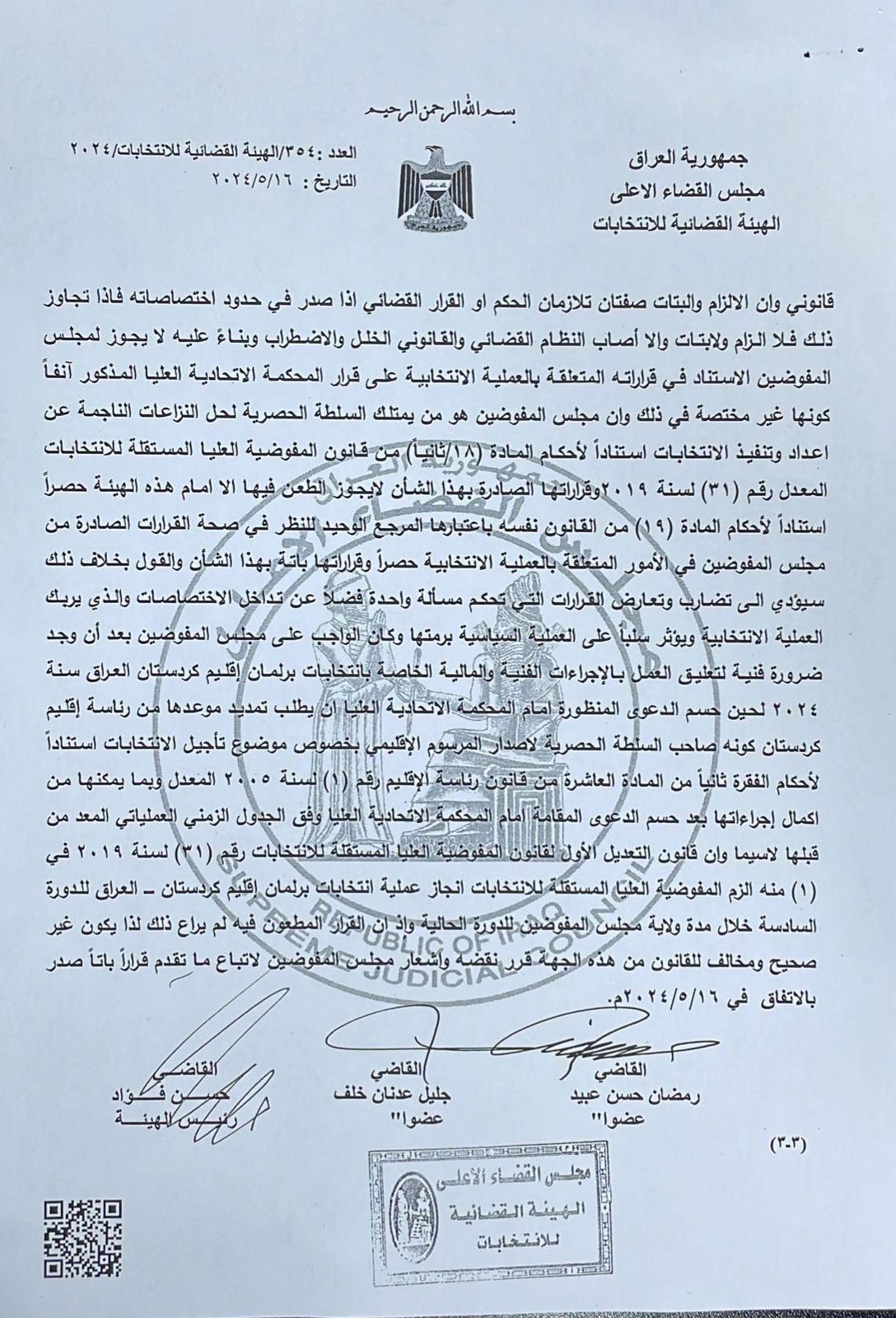دادگای فیدراڵیی عێراق سكاڵاكەی مەسروور بارزانیی قبووڵ كردووە و ڕۆژی ٧-٥-٢٠٢٤ بڕیارێكی لە بەرژەوەندیی سكاڵاكەی مەسروور بارزانی دەركرد، كە بە فەرمانێكی سالاری بڕیاری دا بە ڕاگرتنی كارەكانی كۆمسیۆن تا سكاڵاكە یەكلایی دەبێتەوە، دواتریش ڕۆژی 19ـی ئەم مانگەی بۆ یەكەم دانیشتنی سكاڵاكە دیاری كرد.