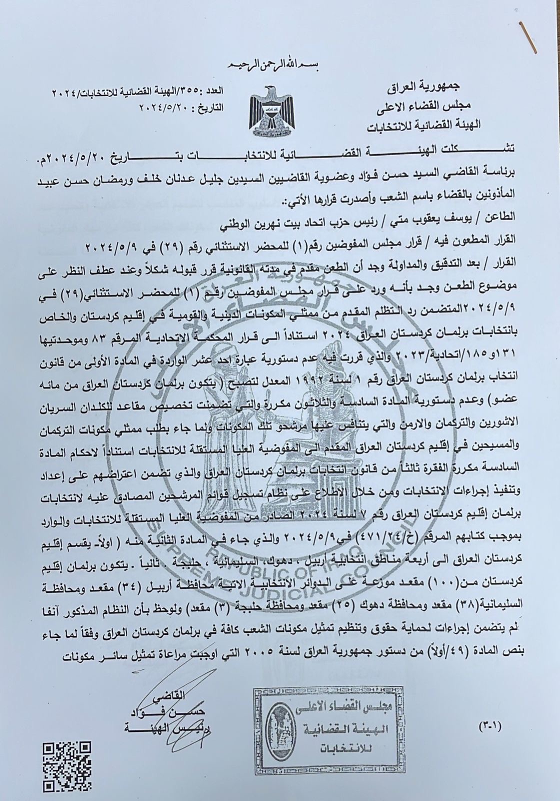 بڕیارەکەی دەستەی دادوەریی هەڵبژاردن لەسەر تانەیەکی یوسف یەعقوب مەتا سەرۆکی حیزبی یەكێتی بەیت نەهرەین دەرچووە کە تانەی لە دابەشکردنی 100 کورسییەکەی پەرلەمانی کوردستان داوە کە پێکهاتەکان بێبەشکراون لێی.