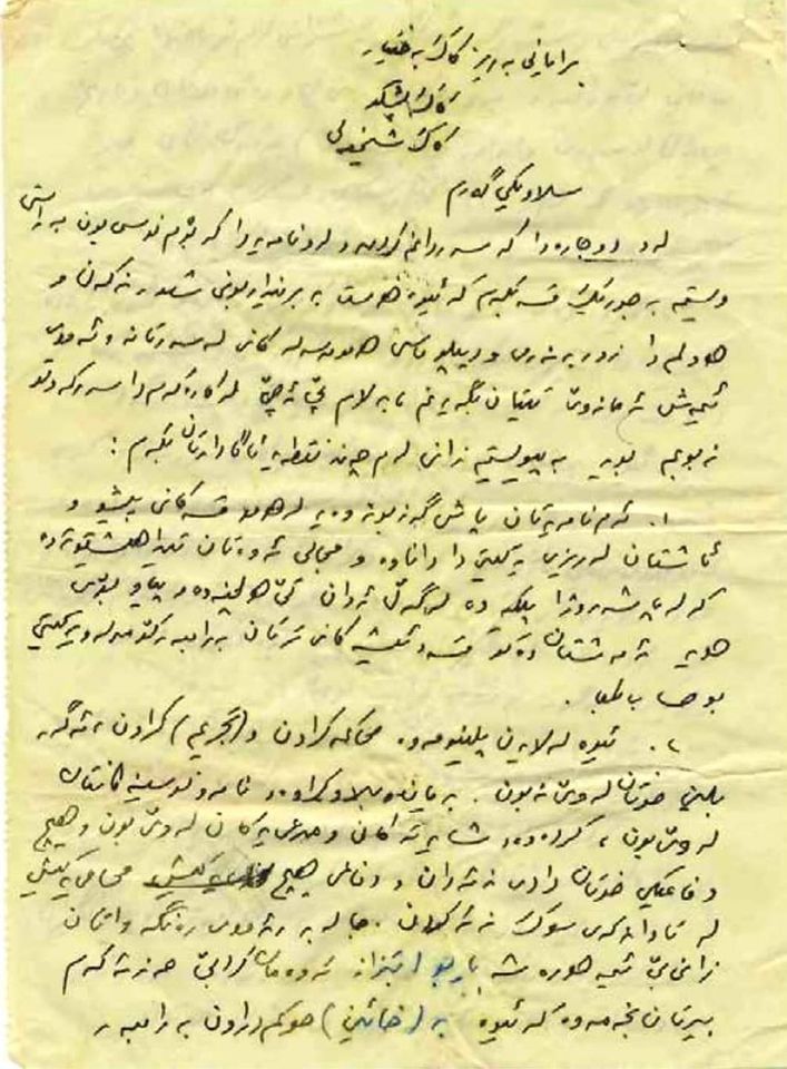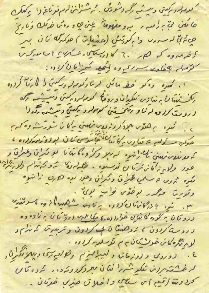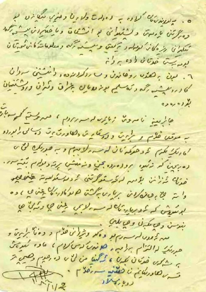 جا براینە نامەوێ زیاتری لەسەر بڕۆم، من ویستم سەبارەت بە موقعی خۆم و برایەتی و دۆستایەتی و هاوڕێیەتی دەساڵی رابردو کارێک بکەم ئەو حوکمەتان لەسەر لاببەم بە جۆرێک لێی دەربچن کە نە ئێوە بەو دەردە بچن و نە منیش پرتە و بۆڵەم بێتەسەر. خۆتان ئەزانن بۆ من لە ئەستۆگرتنی ئەو مەسئولیەتە واتە جێبەجێنەکردنی بڕیاری بەگشتی هەمو کادرەکان یەعنی چی، وە بۆ ئێوەش کە ئەو بڕیارەتان لەسەر لابچێ چی یەعنی چی و ئەبێ و چی بنوسن و چی بکەن و چی بڵێن.
