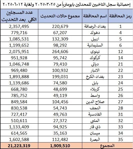 بەپێی نوێترین داتای نوێكردنەوەی تۆماری دەنگدەران كە ئەمڕۆ پێنجشەممە 12-06-2025 كۆمیسیۆنی هەڵبژاردنەكانی عێراق بڵاوی كردووەتەوە، لە سەرتاسەری عێراق لە دوو مانگ و 15 ڕۆژی ڕابردوودا، یەك ملیۆن و 909 هەزار و 510 دەنگدەر تۆمارەكانیان نوێ كردووەتەوە، بە كۆی گشتییش 21 ملیۆن و 223 هەزار و 319 دەنگدەر تا ئێستا تۆماریان نوێ كردووەتەوە.