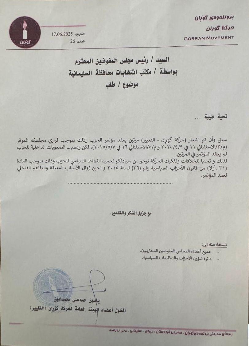 ئاڕاستەی گردی زەرگەتەی گۆڕان کە ئاڕاستەی کوڕەکانی نەوشیروان مستەفایە، نووسراوێکیان ئاڕاستەی کۆمسیۆنی هەڵبژاردن کردووەو تێیدا داوا دەکەن چالاکییە سیاسییەکانی بزووتنەوەی گۆڕان سڕ بکات.