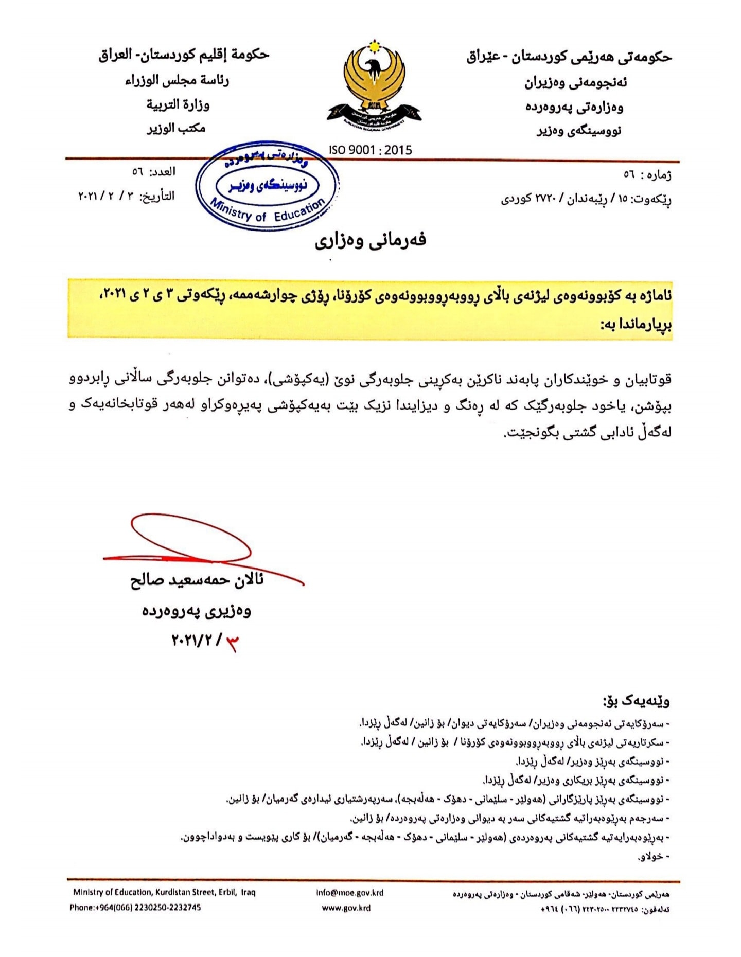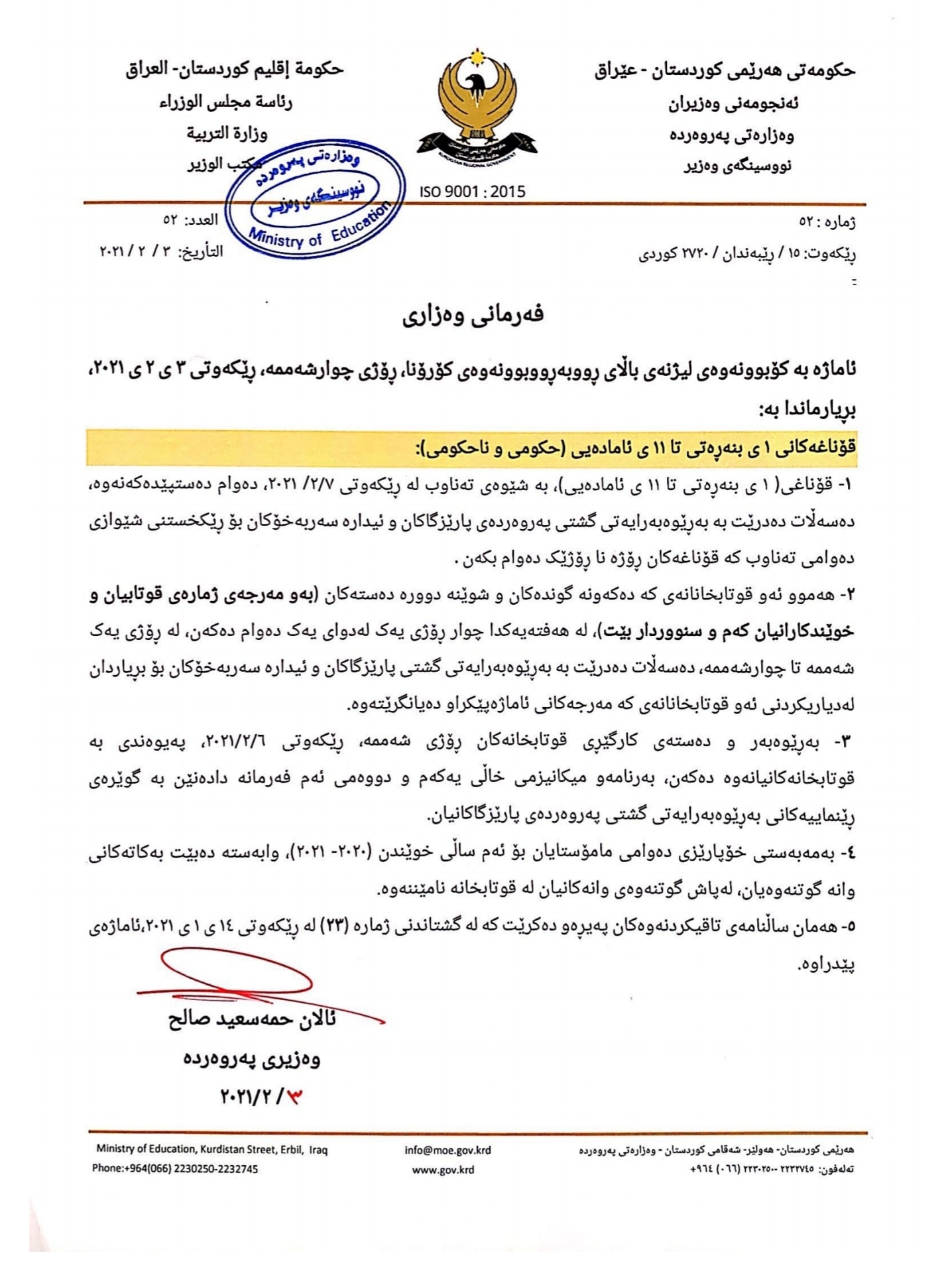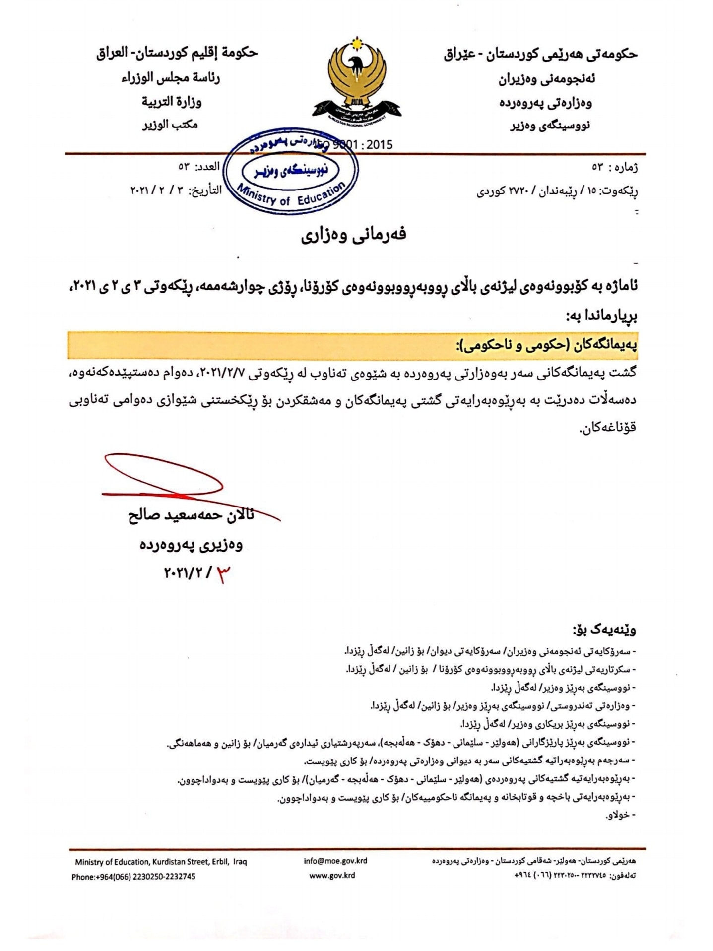 نووسراوە فەرمییەکانی وەزارەتی پەروەردە سەبارەت بە وردەکاریی پلانی پەسەندکراو لە کۆبوونەوەی لیژنەی باڵای بەرەنگاربوونەوەی ڤایرۆسی کۆرۆنا لە ڕۆژی چوارشەممە ٣ - ٢ -٢٠٢١ سەبارەت بە دەستپێکردنەوەی پرۆسەی خوێندن.