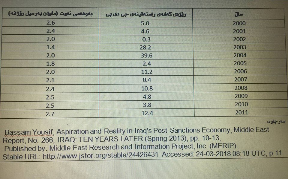 لە چیرۆكە سواوەكەوە دەستپێدەكەمەوە: ئابوریی نەوتیی. سەیری خشتەكە بكە، دەبینیت بەرهەمی نەوت لە عێراقدا لە نێوان 2003-2011 گەشەكردنێكی ئەوتۆی بەخۆوە نەبینیوە. بەو هەمو هەوڵەوە، تازە بە تازە لە 2009 و 2010 توانیویەتی بگەڕێتەوە بۆ ئاستی بەر لە جەنگ. بەڵام لە نێوان 2006 بۆ 2011، داهاتی نەوت لە 40 ملیارد بۆ 86 ملیارد بەرزبۆتەوە. هۆی ئەم زیادبونە نرخ بوو. نرخی نەوتی بەسرە لە 23 دۆلار لە ساڵی 2000 بەرزبوەوە بۆ 106 دۆلار لە 2011. ئەم بەرزبونەوەیە هیچ ئازایەتییەكی بڕیاربەدەستان و كاندیدەكانی كورد و عەرەبی لە عێراقدا تێدانەبوە.