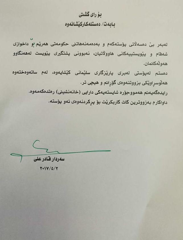 سەردار قادر لە نامەی دەستلەكار كێشانەوەكەیدا كە وێنەیەكی دەست پەرەگراف كەوتووە، هەموو جۆرە شایستەیەكی دارایی(خانەنشینی) ڕەتدەكاتەوە.