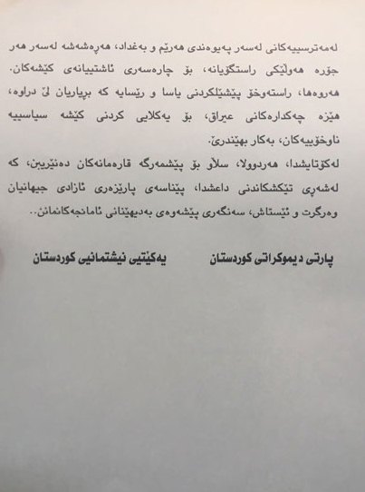 پارتیو یەكێتی لە ڕاگەیەندراوەكەیاندا وەڵامی هیچ داواكارییەكی بەغدایان نەداوەتەوە لەبارەی ئاڵۆزییەكانی كەركوك تەنها تەئكید لە گفتوگۆ دەكەن، لەكاتێكدا حكومەتی عێراق سوورە لەسەر گرتنەدەستی دەسەڵات لەو پارێزگایەو گەڕاندنەوەی نەوتەكەی بۆژێر دەسەڵاتی خۆی.