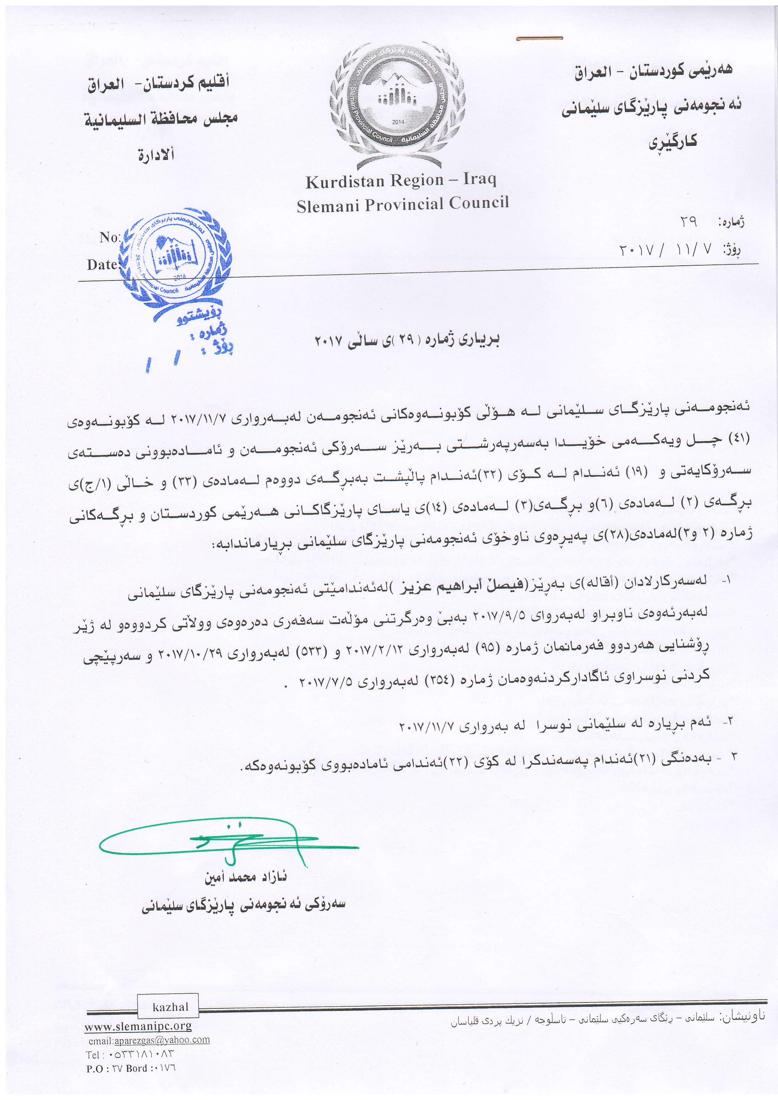بڕیاری ئەنجومەنی پارێزگای سلێمانی دەربارەی لەكارلادانی فەیسەڵ ئیبراهیم