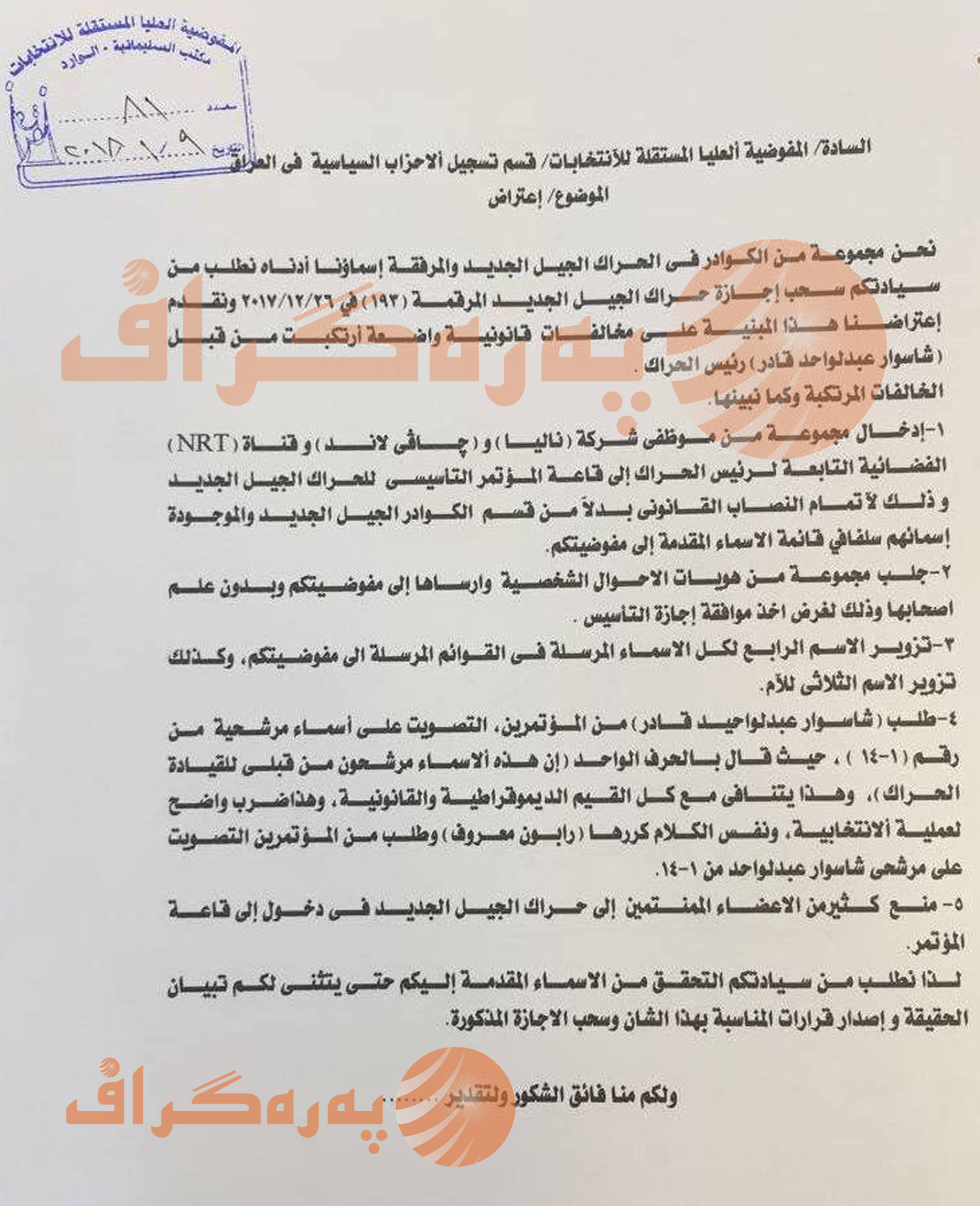 ئێمە كۆمەڵێكین لە كادرەكانی بزوتنەوەی نەوەی نوێ كە ناوەكانمان هاتووە داوا لە بەڕێزتان دەكەین مۆڵەت لە بزوتنەوەی نەوەی نوێ بكێشنەوە بە ژمارە (193) لە 26-12-2017. ئەم تانەیەمان پێشكەش كردووە لەسەر بنەمای ئەو سەرپێچییە یاساییە ڕوونانەی كە (شاسوار عەبدولواحید قادر) سەرۆكی بزوتنەوەكە ئەنجامیداوە.