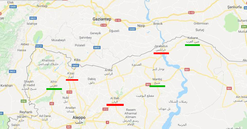 لە نەخشەكەدا كۆبانی، مەنبەج‌و عەفرین هێڵی سەوزیان بە ژێردا هاتووەو بەدەست یەپەگەوەن، جەرابلوس‌و باب‌و عەزاز هێڵی سوریان بە ژێردا هاتووەو بەدەست توركیاوەن.