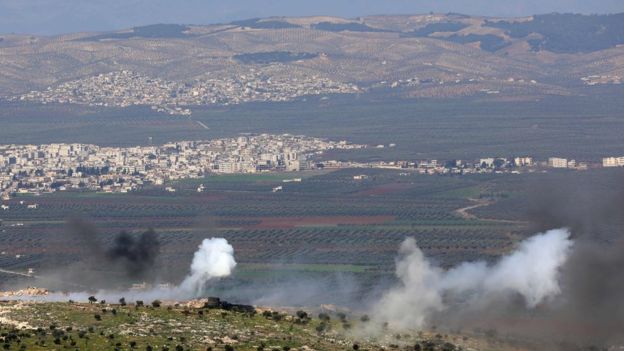 بەرزبوونەوەی دووكەڵ لە ئەنجامی بۆردومانەكانی توركیا لە عەفرین. وێنە؛ ئەی ئێف پی.