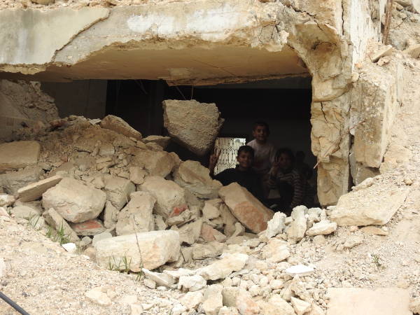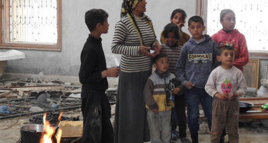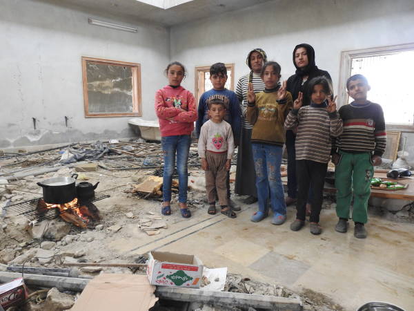 "لە ژوورێكی خانووەكەدا كە لە لایەن داعشەوە تێكدراوە، تەنیا ڕاخەر و چەند بەتانییەك هەن؛ كەلوپەلی خێزانێكی 10 نەفەری كە 6یان منداڵن هەر ئەوەندەیە."