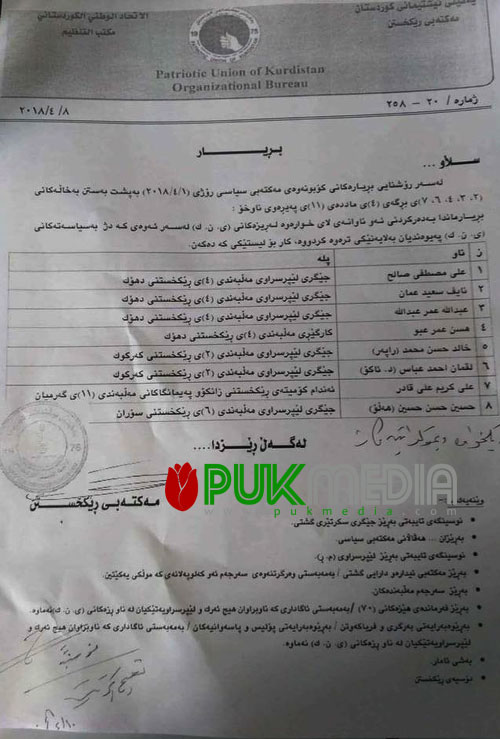 بڕیارەكەی یەكێتی بۆ دەركردنی چەند بەرپرسێك