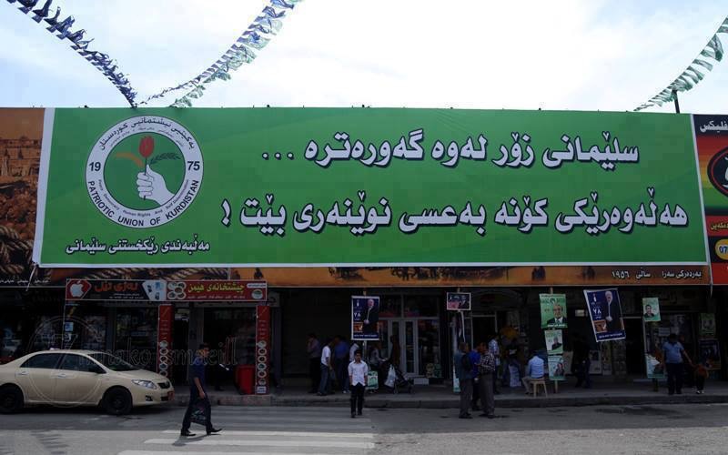 پۆستەری یەكێتی كە لە بەردەركی سەرای سلێمانی هەڵواسرا دژی هەڤاڵ ئەبوبەكر لە هەڵبژاردنی 2014. وێنە؛ زمناكۆ ئیسماعیل.