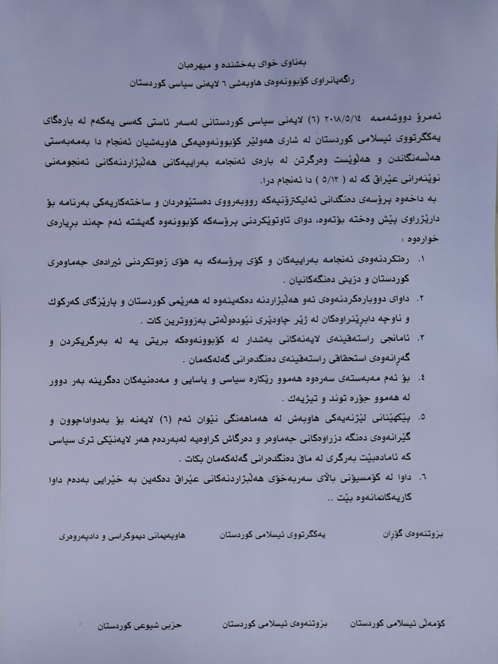 كەسانی یەكەمی هەریەكە لە گۆڕان، یەكگرتوو، كۆمەڵ، هاوپەیمانی، شیوعیو بزوتنەوەی ئیسلامی كۆبوونەوەو 6 بڕیاریان دەركردو ئەنجامی هەڵبژاردنو كۆی پڕۆسەكە ڕەتدەكەنەوەو داوای ئەنجامدانەوەی دەكەن لە هەرێمو ناوچە دابڕاوەكان بە زوترین كات.