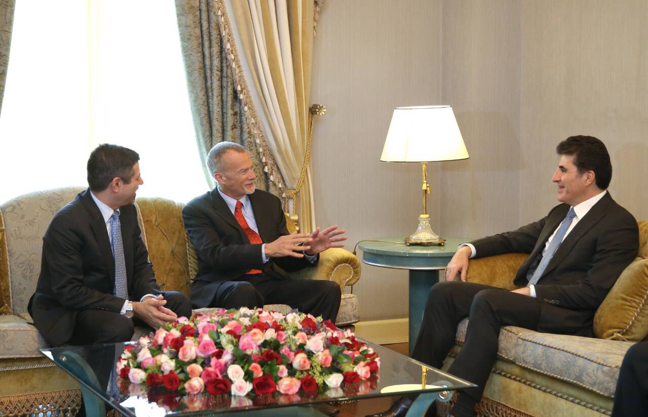 دیداری نێچیرڤان بارزانی لەگەڵ ستیڤن فاگنو كونسوڵی پێشووی ئەمەریكا/ 23-7-2018. وێنە؛ ماڵپەڕی حكومەتی هەرێم.