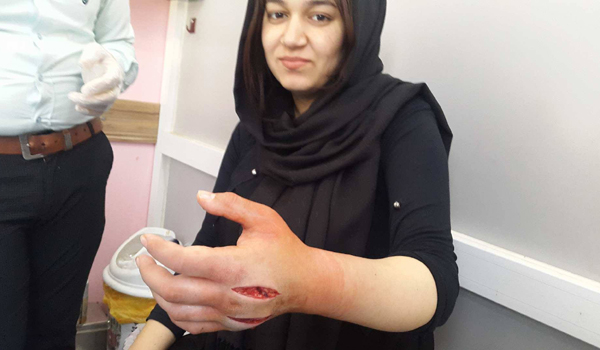 كەركوك، 25-4-2017، نۆزان سەڵاحەدین دوای قڵیشانی دەستی بەهۆی دەرزییەكەوە، فۆتۆكە لەلایەن هاوسەرەكەیەوە گیراوەو بڵاوكراوەتەوە.