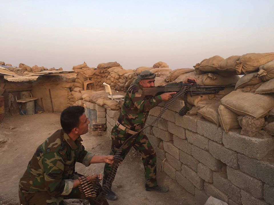 خدر شاوری(بیكەیسی بەدەستەكە) لەگەڵ پێشمەرگەیەك لەبەرەی پێشەوەی شەڕی داعش.